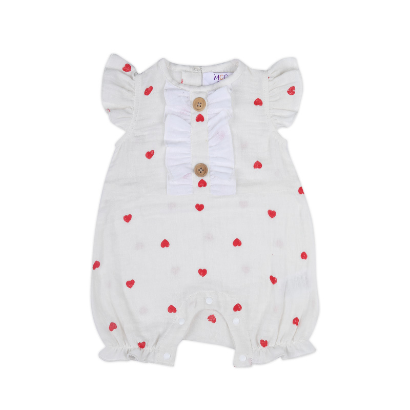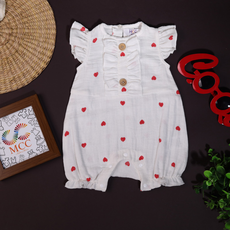 COLOUR- Cherry Pop White A flutter-sleeve romper sprinkled with sweet red dots—perfect for playful days.
