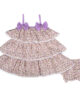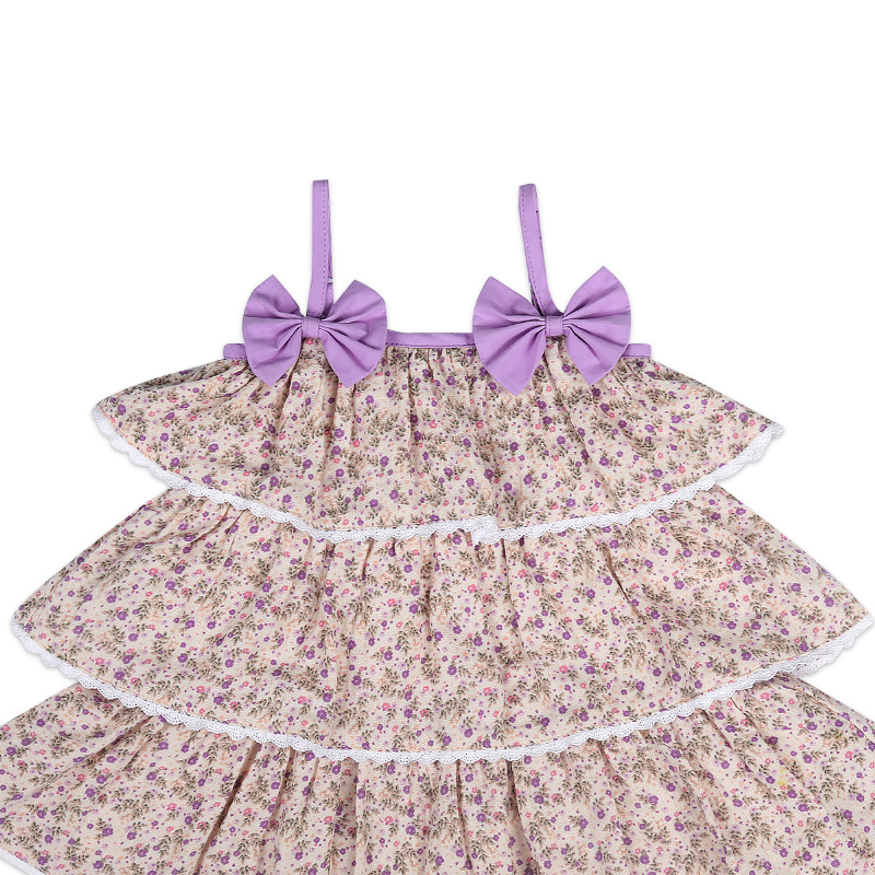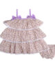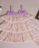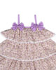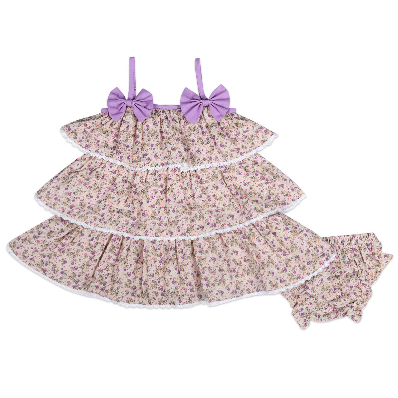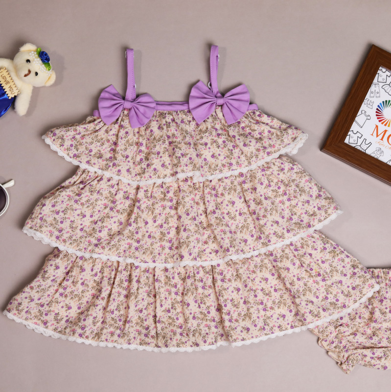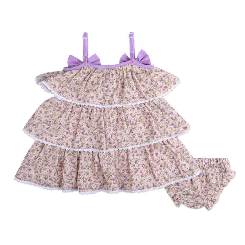 COLOUR- Soft Orchid Blush A triple-tiered floral frock with lilac bows and matching bloomer—frilly and fun!